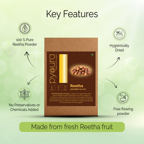 Experience the natural cleansing power of PYOURA Reetha Powder for Hair—a 100% pure and natural herbal scalp & hair foaming cleanser. Reetha, also known as Soapnut, has been used in Ayurveda for centuries as a gentle, chemical-free shampoo alternative. Its natural foaming properties deeply cleanse the scalp, remove excess oil, dirt, and impurities, while maintaining the scalp’s natural pH balance. Regular use helps strengthen hair roots, add shine, and keep your hair soft, smooth, and manageable—all without added chemicals or preservatives.