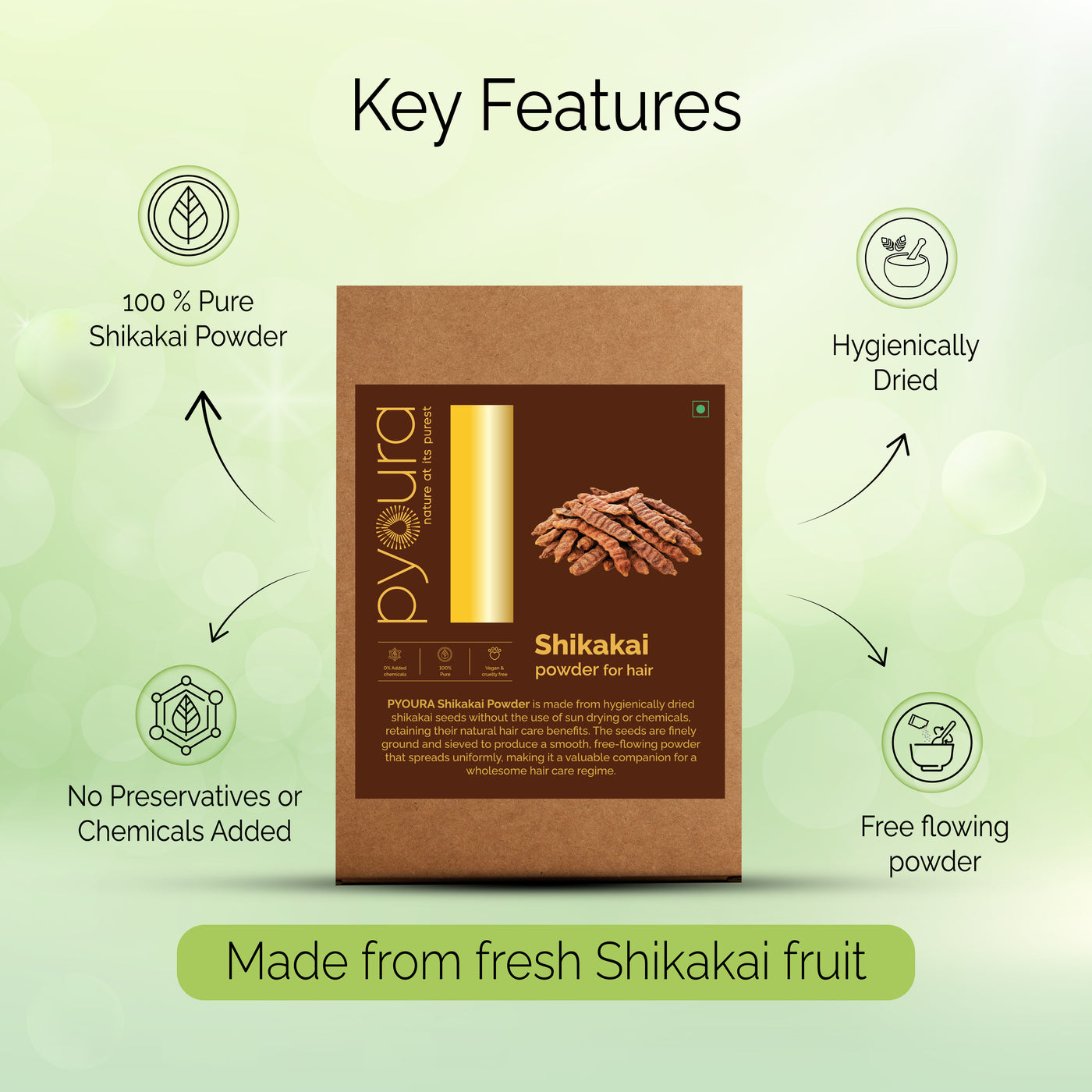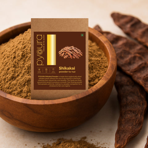 Nourish your hair with the age-old goodness of PYOURA 100% Pure Shikakai Powder for Hair—a natural cleanser and conditioner trusted in Ayurveda. Shikakai gently cleanses the scalp without stripping away natural oils, helping to reduce dandruff, strengthen roots, and promote healthy hair growth. Rich in vitamins and antioxidants, it adds softness, shine, and volume to your hair. Packaged with a wooden spoon and brush for easy use, this pure herbal powder is free from chemicals and preservatives, making it a safe and natural choice for your daily hair care routine.